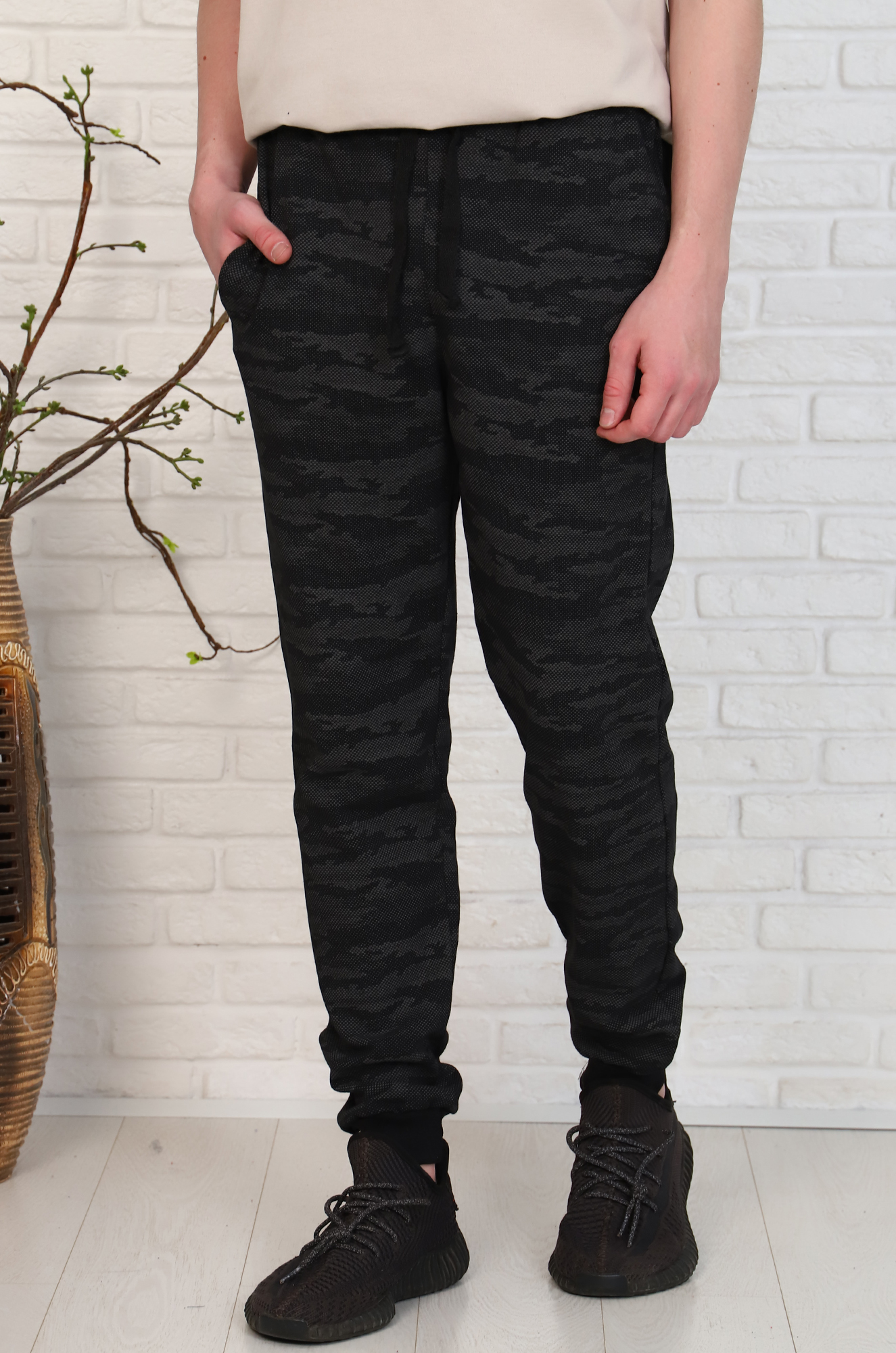 Стильные спортивные брюки для модного городского образа. Модель снизу на манжетах, пояс на широкой резинке и со шнурком, удобные боковые карманы. Расцветка ткани с набивным эксклюзивным рисунком в стиле "милитари" делает модель интересной и эффектной. Ткань футер двухнитка с небольшим начёсом, мягкая и приятная к телу. |