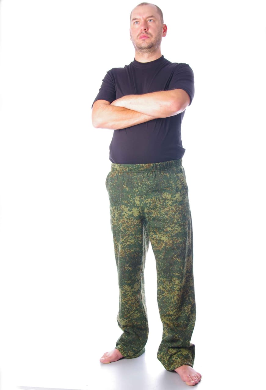 Брюки мужские-камуфлированные прямого кроя, с двумя боковыми карманами, пояс изделия изготовлен на специальной машине. При изготовление брюк используется ткань - футер облегченный, плотностью 200 гр/м2. Хороший и практичный вариант для любителей одежды из камуфляжа. |