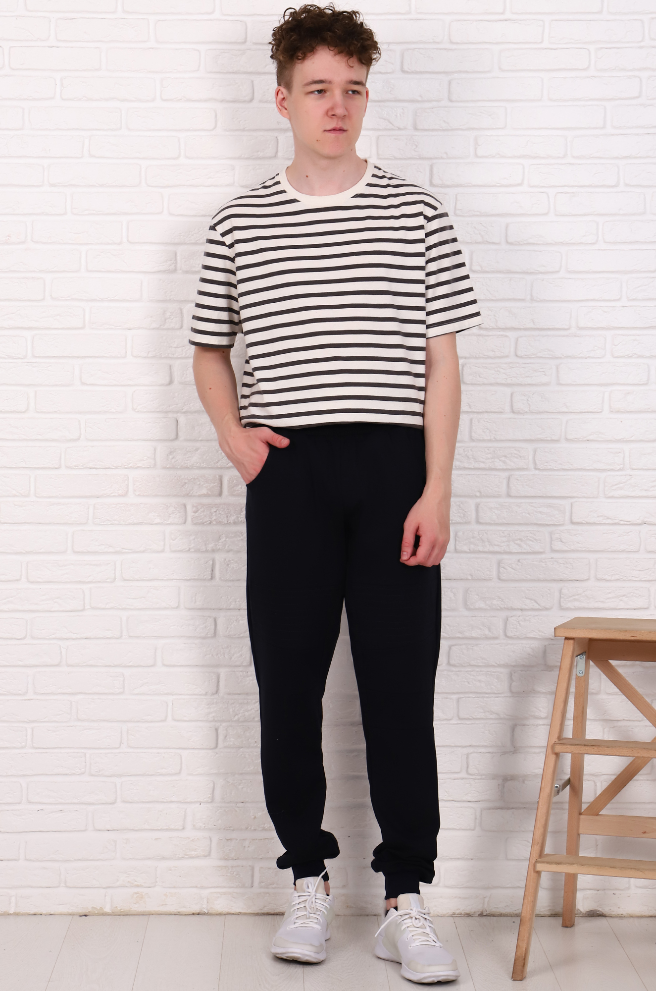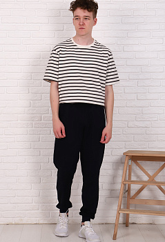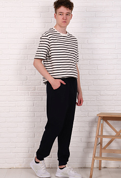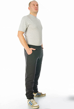 Модные зауженные спортивные брюки со стильной отстрочкой. Модель сложная, с отрезными деталями. Удобный пояс на резинке, внизу манжеты. Ткань - мягкий, теплый футер с небольшим начесом. |