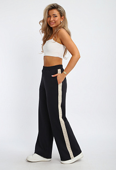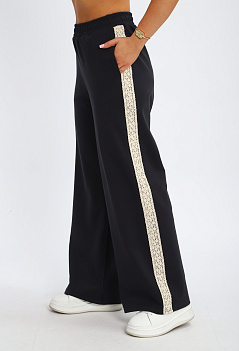 Женские стильные брючки "палаццо" с лампасами из кружева. Пояс на широкой резинке, удобные боковые карманы, очень комфортная посадка. Ткань футер с лайкрой, приятная к телу и практичная в носке. |