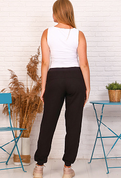 Женские брюки на манжетах из футера с лайкрой, изделие с широким эластичным поясом на завязках. Хороший вариант и для дома, и для прогулок. |