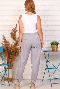 Женские брюки на манжетах из футера с лайкрой, изделие с широким эластичным поясом на завязках. Хороший вариант и для дома, и для прогулок. |