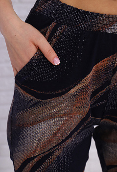 Стильные хлопковые брючки зауженной модели - прекрасный вариант на летний сезон. Модель комфортной посадки, с удобными боковыми карманами, пояс на широкой резинке, простроченный на спец. машине. Брюки универсальные, подойдут и для дома, и для отдыха, и для прогулок. Хорошо сочетаются с майками, футболками, топами. Ткань кулирка с набивным рисунком - мягкая, приятная к телу. |