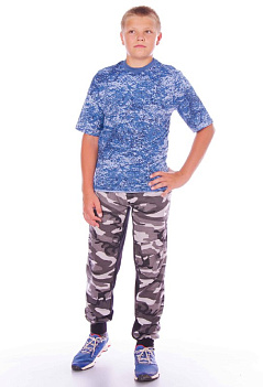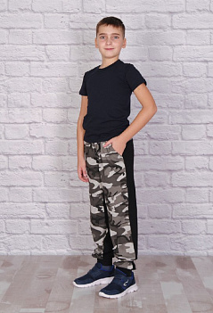 Оригинальная комбинированая модель брюк на манжетах в стиле "Милитари". Ткань кулирка: спереди камуфляжная, сзади - черная однотонная. Пояс на широкой резинке, имитация гульфика, два удобных боковых кармана. Модель сложная, с отрезными деталями, на колене клапан - имитация кармана. |