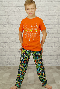 Удобный хлопковый костюм подойдёт и для сна, и для домашних игр. Однотонная футболка прямого кроя украшена печатным принтом. Брюки с набивным рисунком, есть боковые карманы, пояс на резинке. Ткань кулирка. |