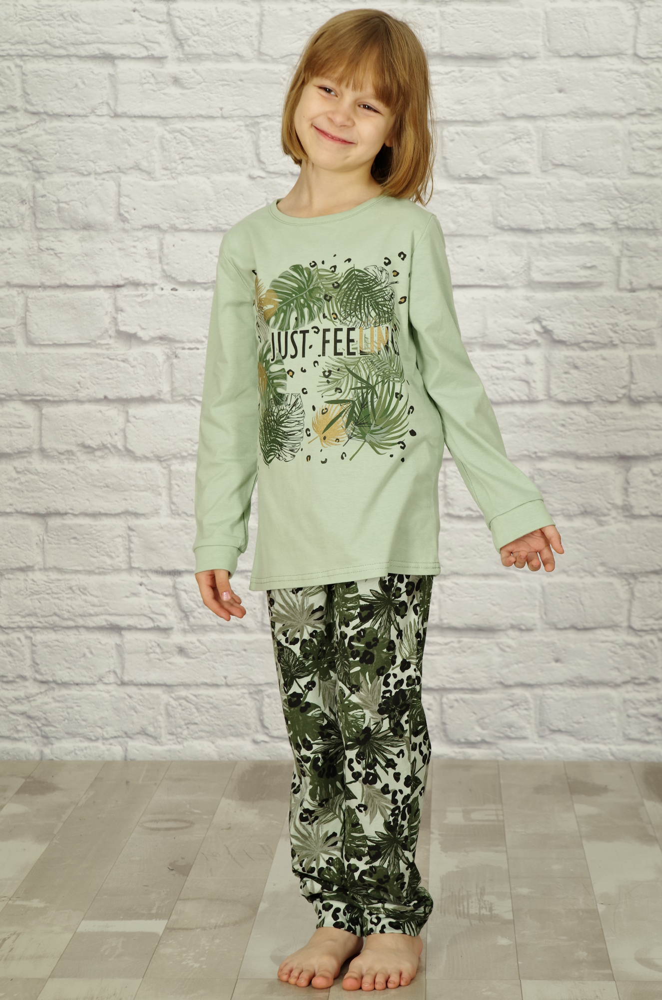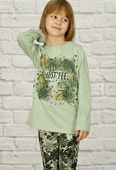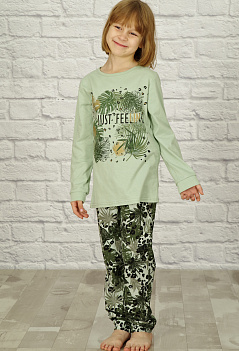 Симпатичная хлопковая пижамка для девочки. Футболка с длинным рукавом, на полочке печатный принт, брючки пёстрой расцветки снизу на манжете из основной ткани, пояс на резинке. Ткань кулирка. |