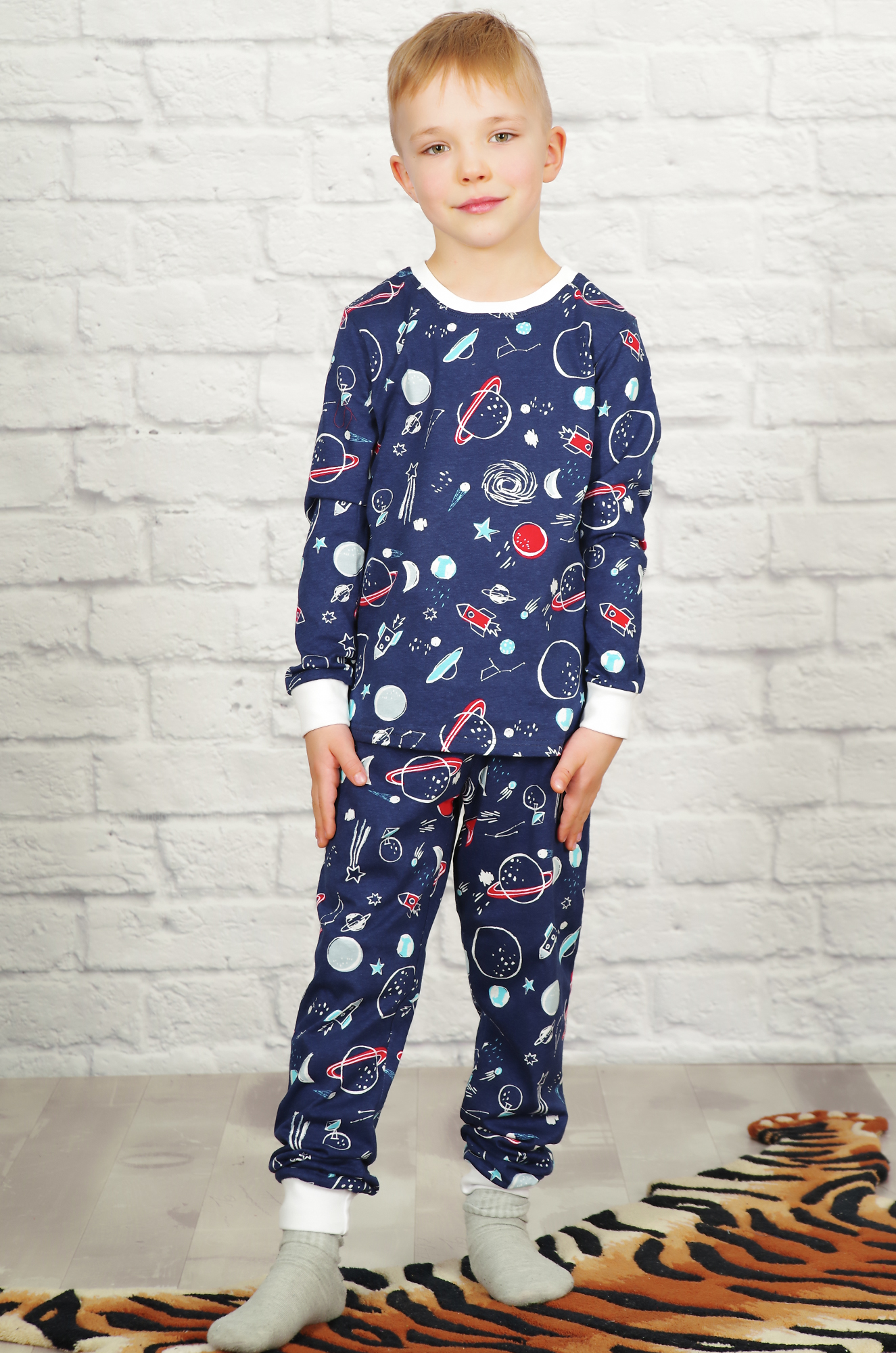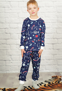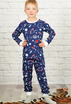 Удобный хлопковый костюм для мальчиков подойдёт и для сна, и для домашних игр. Футболка однотонная, прямого кроя с длинным рукавом. Брюки снизу на манжетах, пояс на резинке. Ткань кулирка с набивным рисунком. |