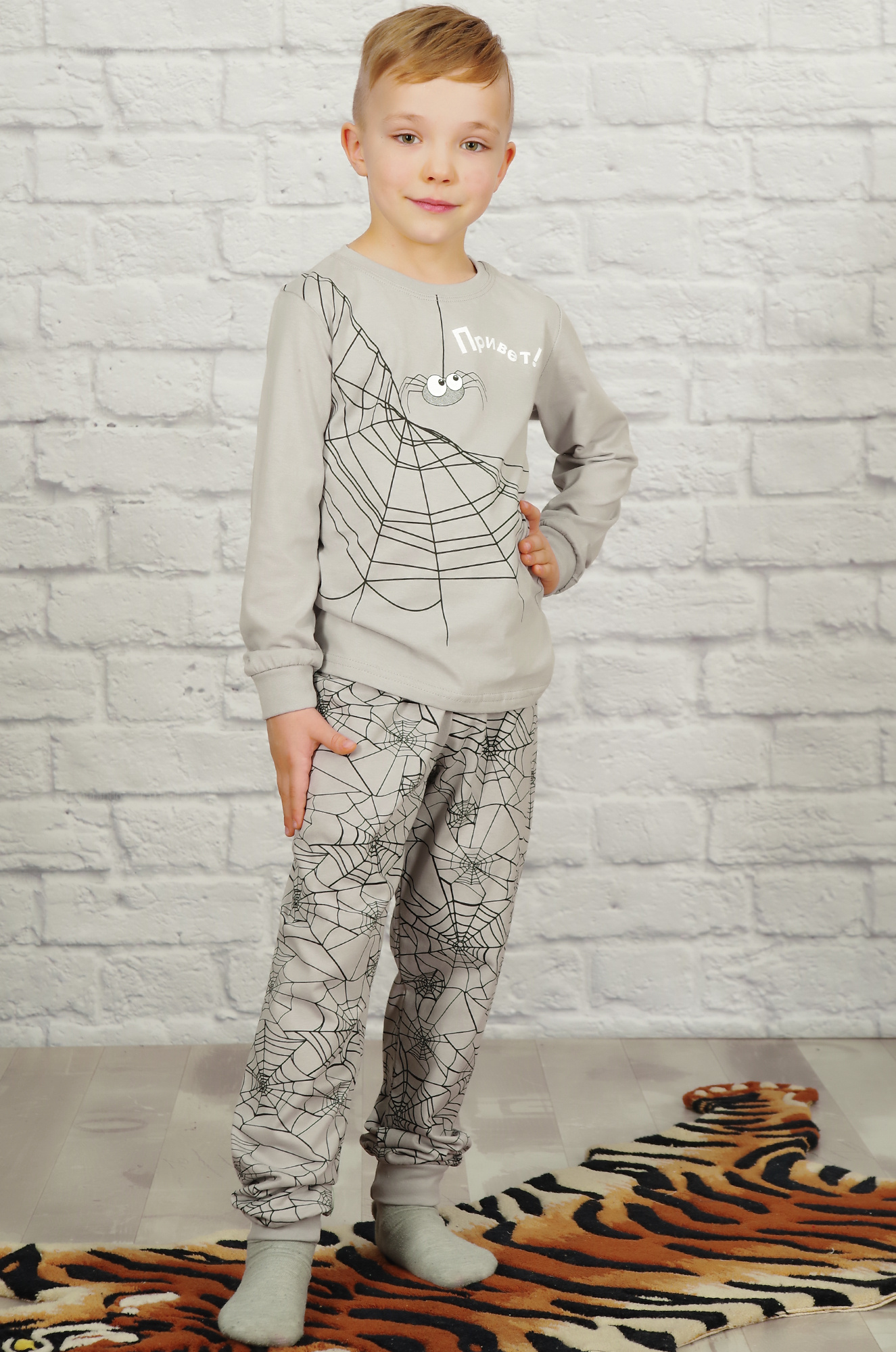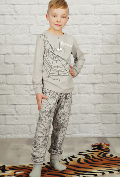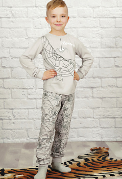 Удобный хлопковый костюм для мальчиков подойдёт и для сна, и для домашних игр. Футболка однотонная, прямого кроя с длинным рукавом, на полочке печатный принт. Брюки с набивным рисунком, снизу на эластичных манжетах, пояс на резинке. Ткань кулирка. |