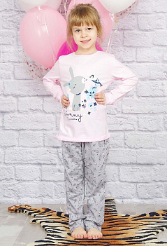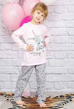 Хлопковая пижамка для девочек подойдёт и для сна и для домашних игр. Футболка прямого кроя, с длинным рукавом, на полочке печатный принт "пушистый кролик". Брючки прямые, пояс на резинке. Ткань кулирка, мягкая и приятная к телу. |