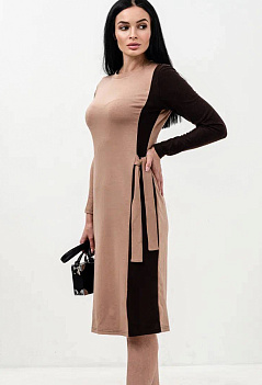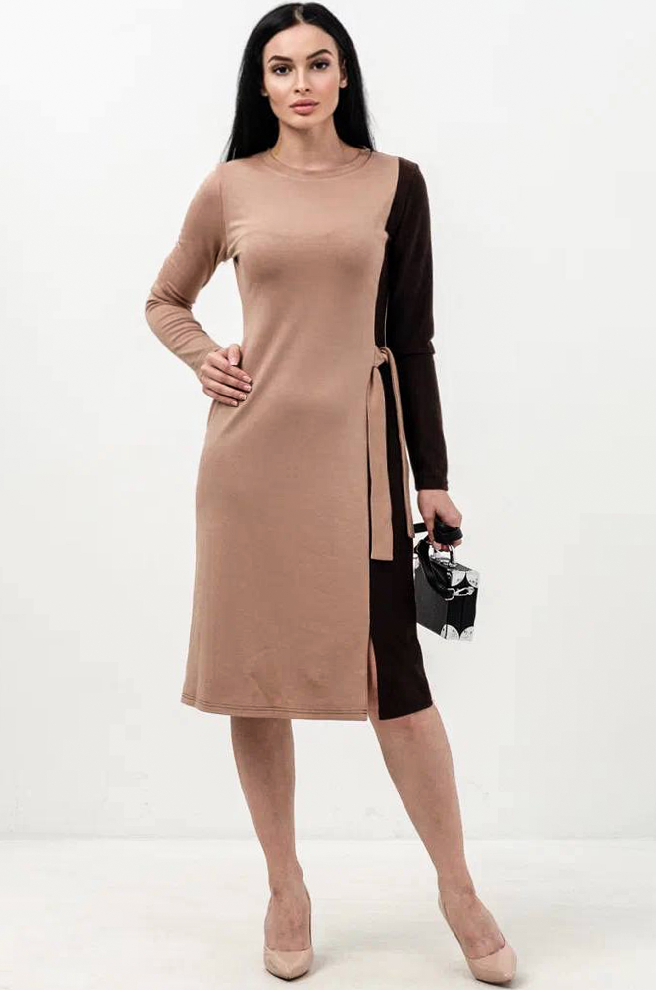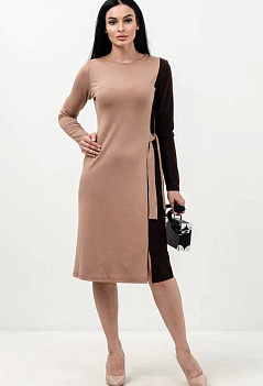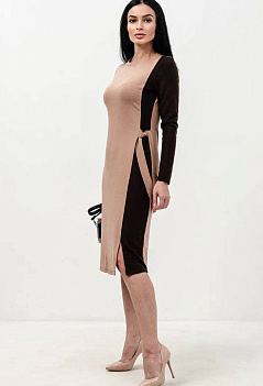 Элегантное женственное платье приталенного силуэта из мягкого, эластичного трикотажа - "милано". Интересное комбинирование тканей мягких цветов, сбоку декоративный пояс и небольшой разрез - образ получается нежным и очень стильным. |