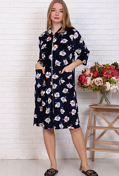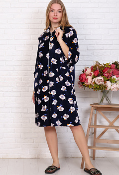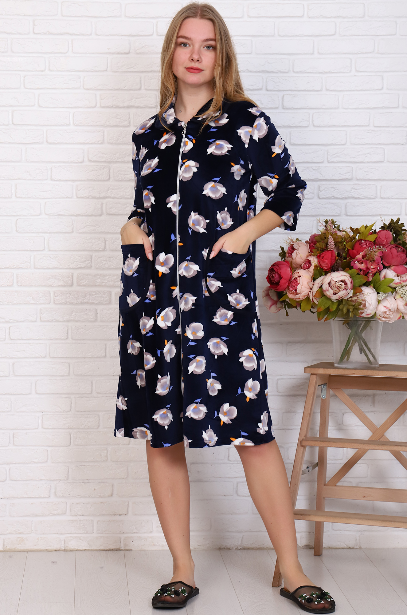 Мягкий, уютный велюровый халатик на молнии. Модель прямого кроя, с отложным воротником, рукав 3/4 на свободном манжете, удобные накладные карманы. Ткань велюр - очень приятный к телу, шелковистый и нежный. |