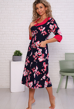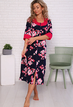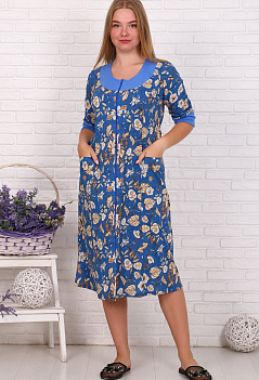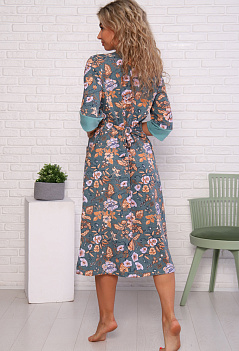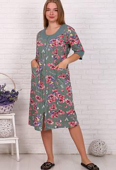 Хлопковый халат на молнии. Модель с глубокими рельефными вытачками и накладными карманами, удобный рукав 3/4, комфортная длина "миди", сзади поясок для моделирования фигуры. Ткань кулирка с набивным рисунком. |
