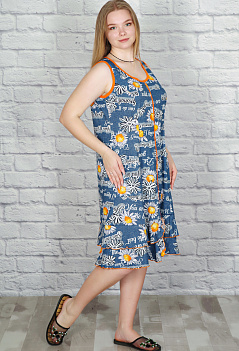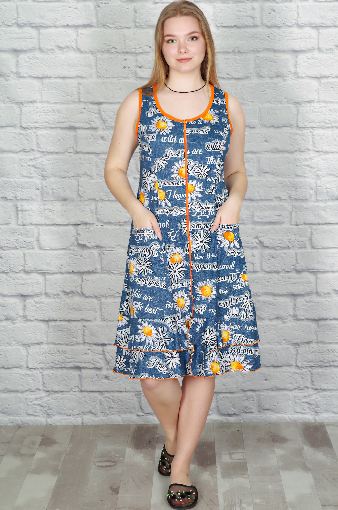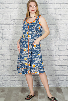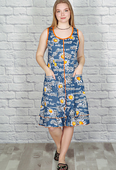 Летний хлопковый халатик на молнии. Модель на широкой бретели, с глубокими рельефными вытачками и накладными карманами, комфортная длина, по низу пришит пышный волан. Ткань лёгкая кулирка с набивным рисунком. |