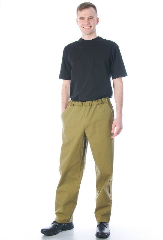 Рабочие брюки с удобным поясом на резинке и боковыми карманами. Выполнены из хлопчатобумажной ткани повышенной плотности - палатка. |