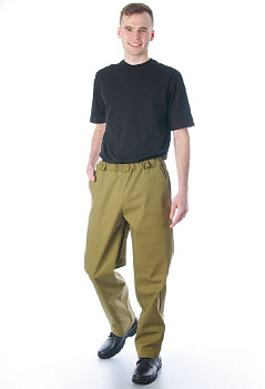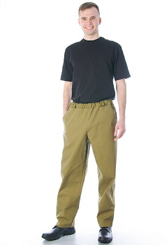 Рабочие брюки с удобным поясом на резинке и боковыми карманами. Выполнены из хлопчатобумажной ткани повышенной плотности - палатка.  |