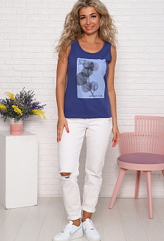 Самая удобная и комфортная летняя вещь в гардеробе - это хлопковая майка. Модель прямого классического кроя на широкой бретели, на полочке эффектный печатный принт. Ткань кулирка - мягкая, приятная к телу. |