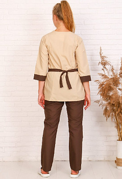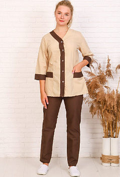 Комбинированный костюм для медицинских работников. Курточка на пуговицах, с глубокими рельефными вытачками спереди и на спинке. Удобные накладные карманы, рукав 3/4, сзади поясок. Брюки прямого кроя, пояс на резинке. Ткань тиси плотностью 120 г/м2.. |