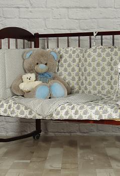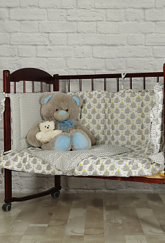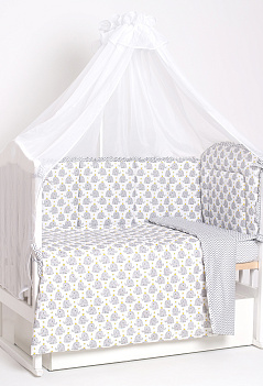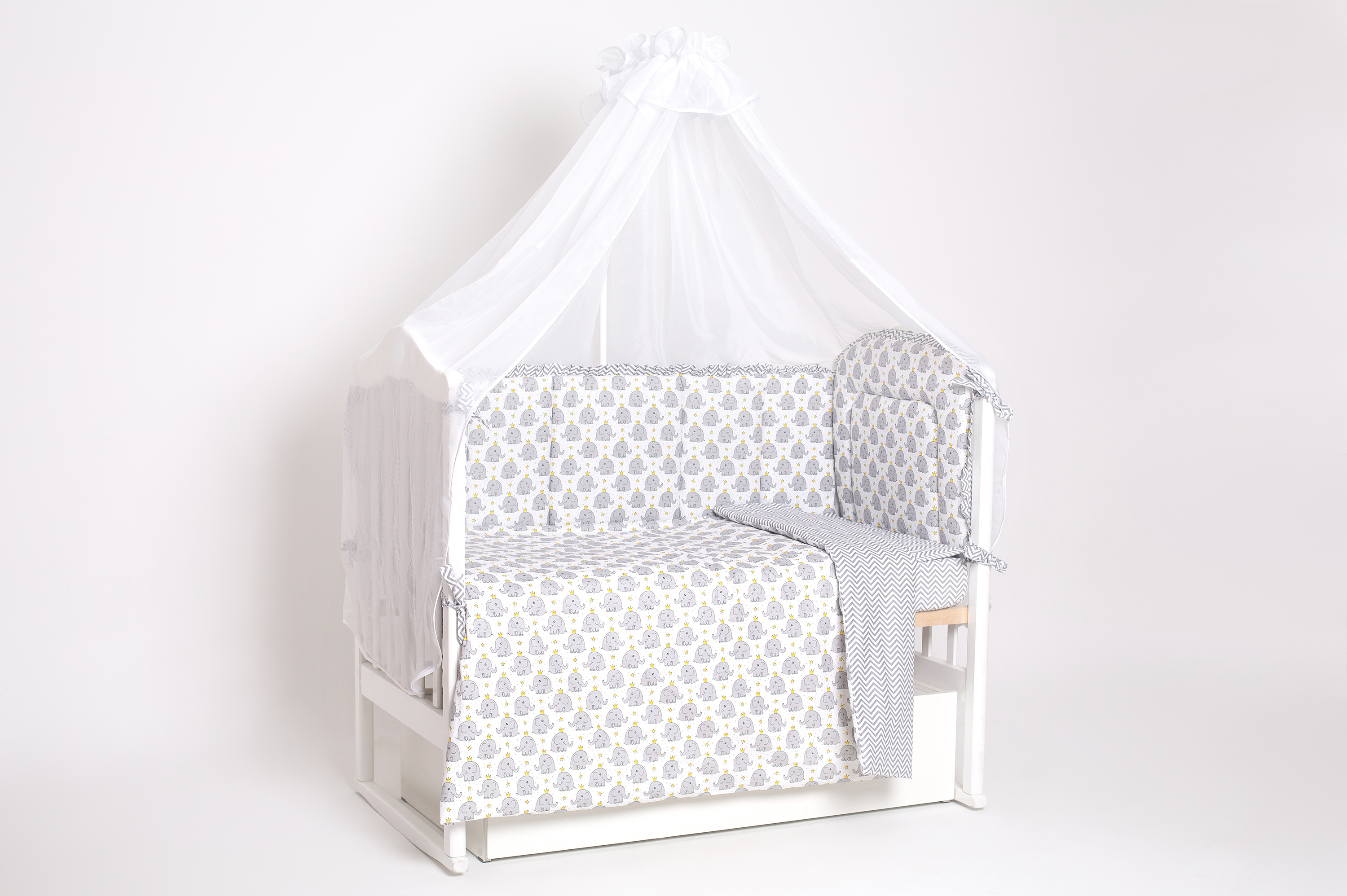 Комплект в детскую стандартную кроватку с мягкими бортиками и балдахином. Такой набор создаст настоящий уют и тепло спальному "гнёздышку". Ткань поплин люкс, плотностью 110-115 г/м2, наполнитель безопасный и современный материал термофайбер, не вызывающий аллергию. Набор упакован в прозрачную сумку. Прекрасный вариант для подарка на рождение ребёнка! В набор входит: Бортики стёганые в кроватку (без молнии) состоит из 4-х частей: изголовье 54х60 см - 1 шт; в ногах 50х60 см - 1 шт; боковые 50х120 см - 2 шт. Пододеяльник: 110х140 см Простыня на резинке 60х120х15 см (для стандартного спального места) Наволочка: 40х60 см Одеяло: 110х140 см (чехол 100% хлопок) Подушка: 40х60 см (чехол 100% хлопок) Балдахин с рюшей: 165х280 см (вуаль 100% п/э). Обратите внимание!!! Крепление для балдахина не входит в комплект! |