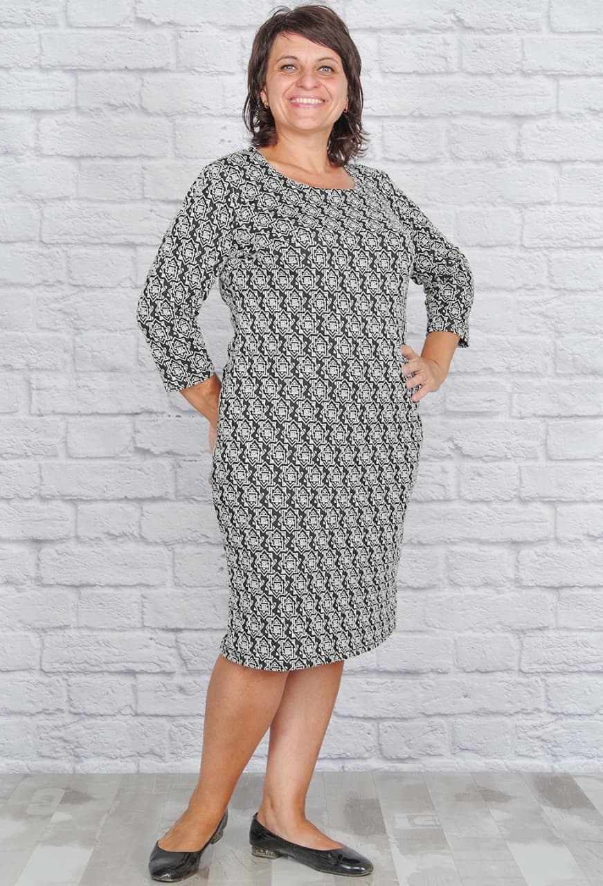 Элегантное женственное платье прямого кроя. Рукав 3/4, женственный округлый вырез горловины, сзади небольшая шлица. Ткань - мягкий фактурный трикотаж из 100% полиэстера. |