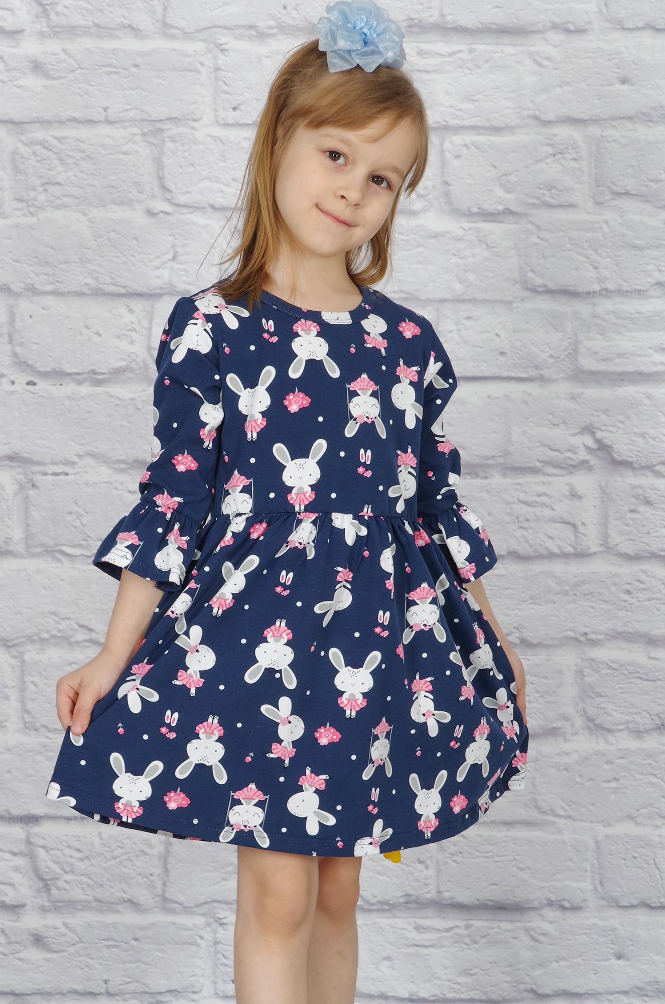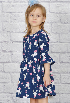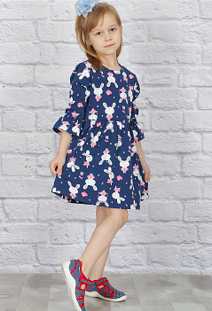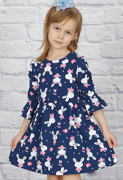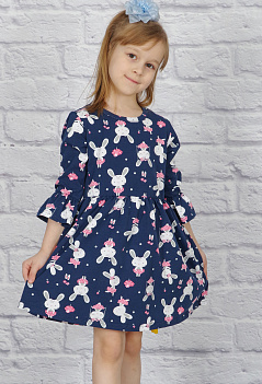 Очаровательное летнее платье для девочки. Пышная отрезная юбка на талии собрана в складочки, рукава 3/4 с воланом. Очень мило смотрится забавный рисунок на ткани "симпатичные зайчата". Ткань - практичная и приятная к телу кулирка с лайкрой качества пенье с набивным рисунком. |