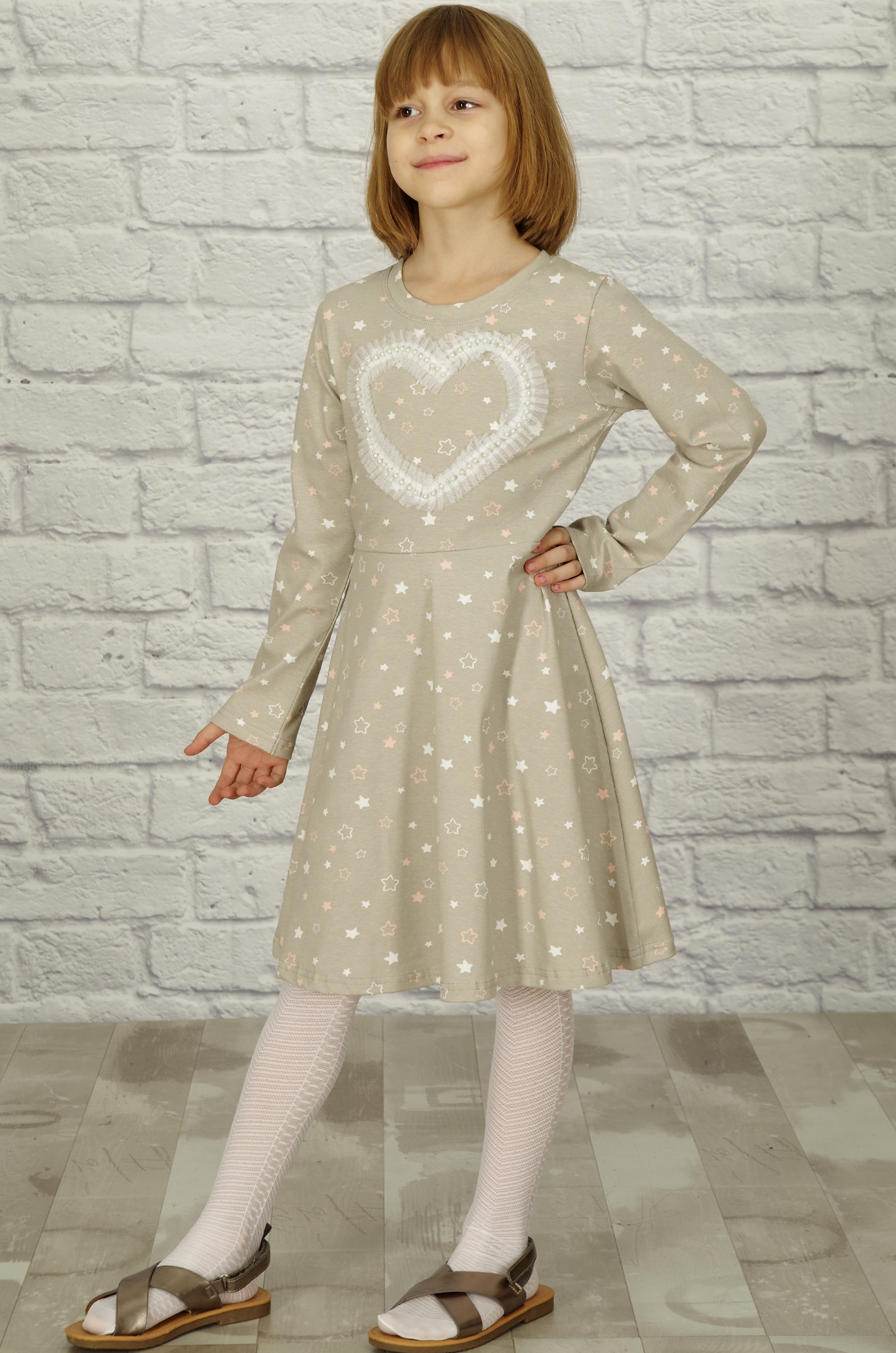 Классическое хлопковое платьице с длинным рукавом нежной спокойной расцветки. Платье отрезное по линии талии, юбка расклешёная. Полочку украшает оригинальная аппликация. Ткань кулирка с лайкрой, мягкая и приятная к телу. |
