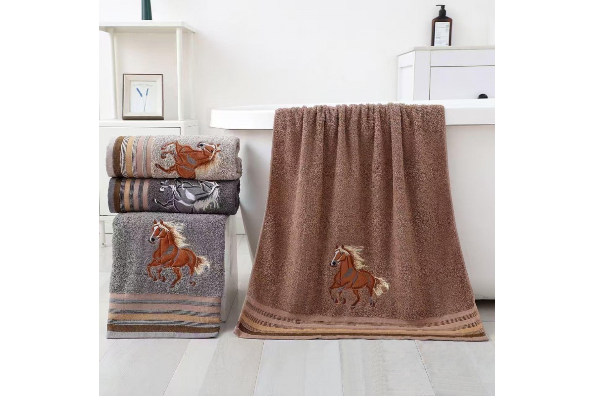 Махровое полотенце с вышивкой по краю с символом наступающего года Лошади. Хорошо впитывает влагу и не линяет.  Производство Китай.  |