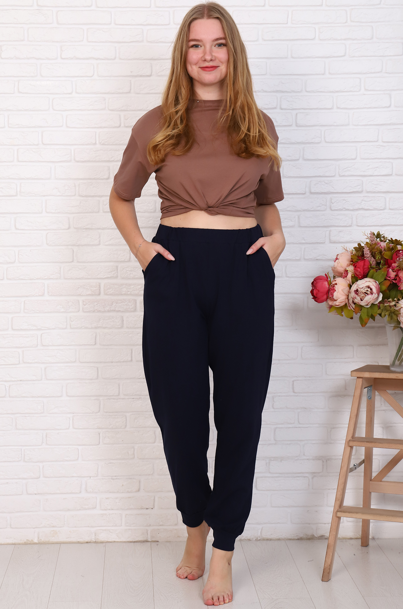 Однотонные хлопковые брючки с боковыми карманами, снизу на манжете, пояс на широкой резинке. Брюки комфортной посадки, отлично сидят на любой фигуре. Ткань - лёгкое, приятное к телу кулирное полотно. |