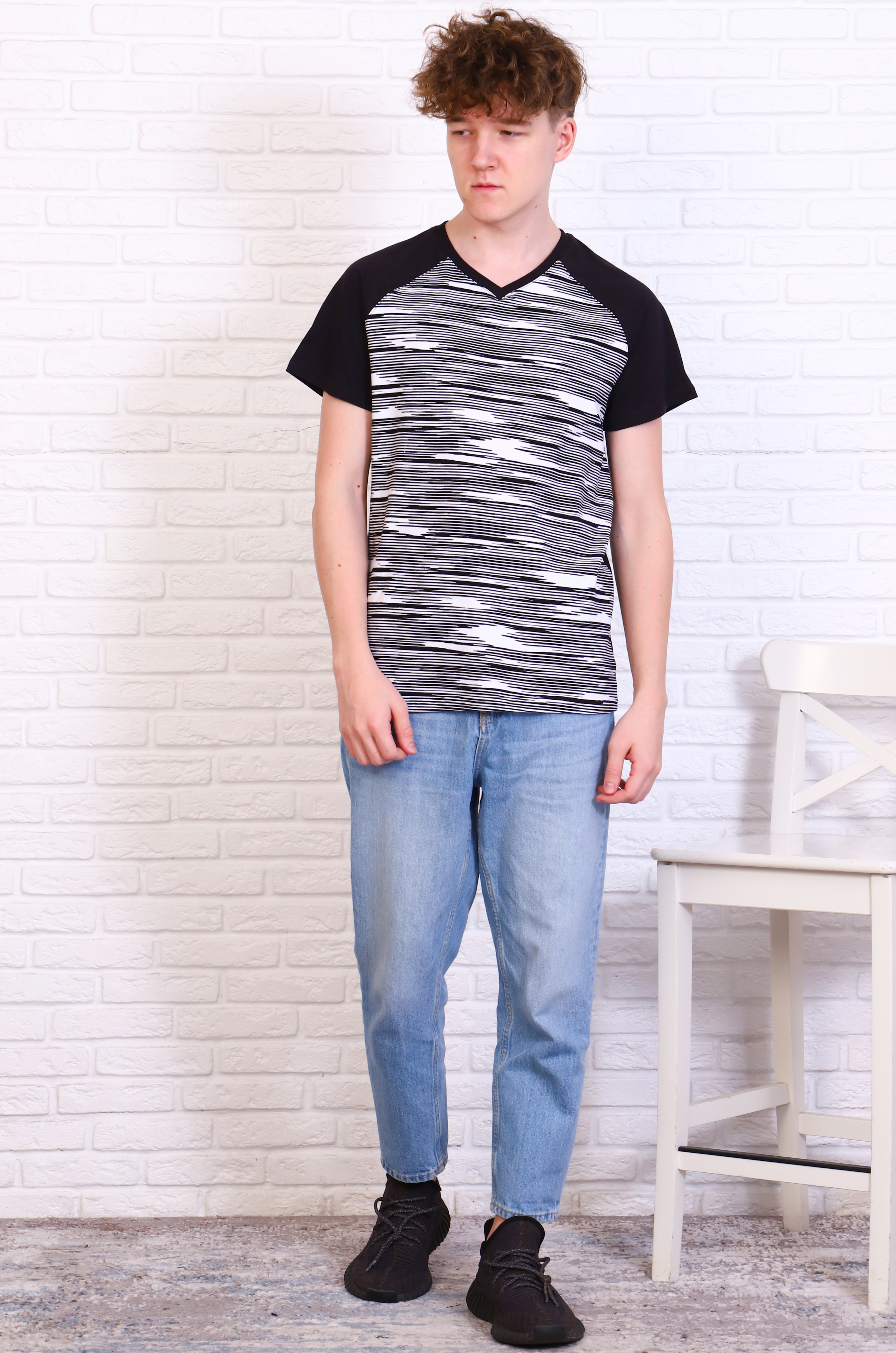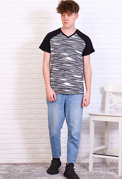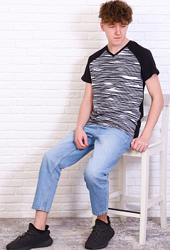 Мужская комбинированная футболка прямого кроя, рукав-реглан, V-образный вырез горловины обработан эластичной рибаной. Ткань: спинка и рукава - кулирка, полочка - кулирка с лайкрой. |