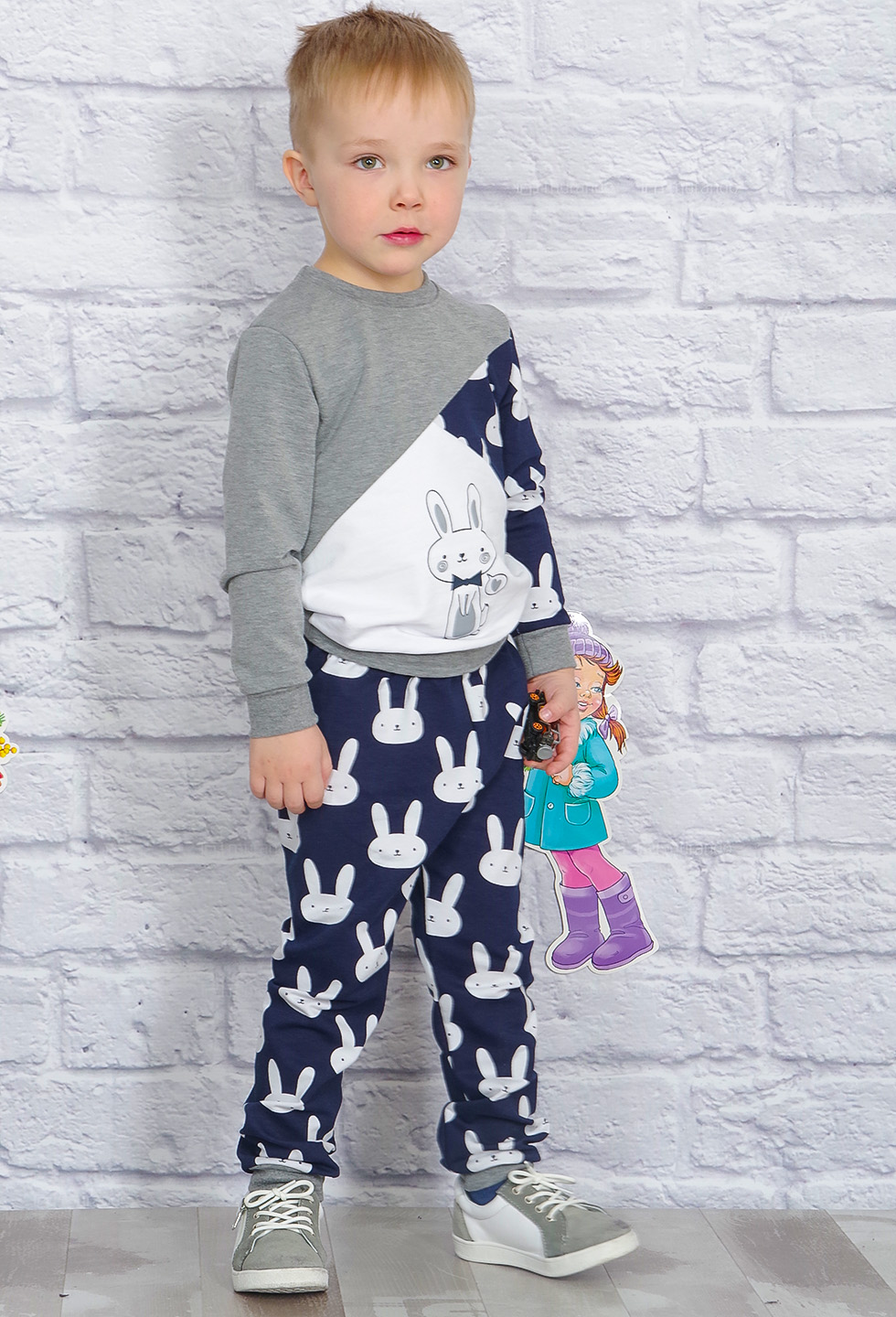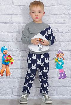 Симпатичный костюм для мальчиков-"зайчиков". Модель толстовки сложного кроя, оригинально скомбинирована и отлично сочетается с зауженными брючками на эластичных манжетах. Горловина толстовки, рукава и низ обработаны рибаной. Брюки с боковыми карманами, пояс на резинке. Ткань петельчатый футер с лайкрой, практичный и удобный в эксплуатации. |