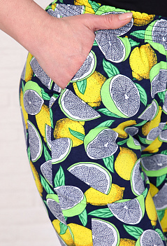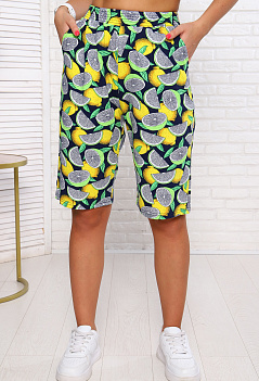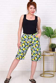 Хлопковые женские шорты-бермуды комфортной длины, пояс на широкой резинке, прострочен на спец. машине, удобные боковые карманы. Ткань кулирка с набивным рисунком. |