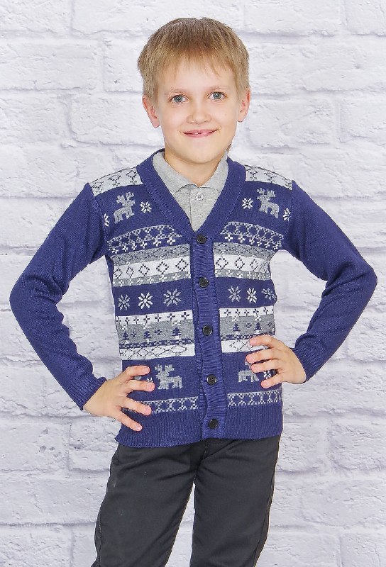 Стильный модный трикотажный кардиган на пуговицах для маленьких джентельменов. Модель с V-образным вырезом, рукава и спинка однотонные, перед декорирован орнаментом на зимнюю тематику. Кардиган подойдёт и к брюкам и к джинсам, это отличный вариант для школы. Производство фабричный Китай. |