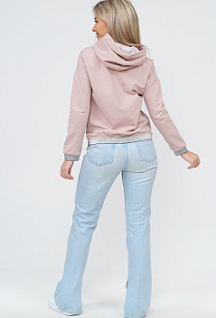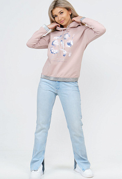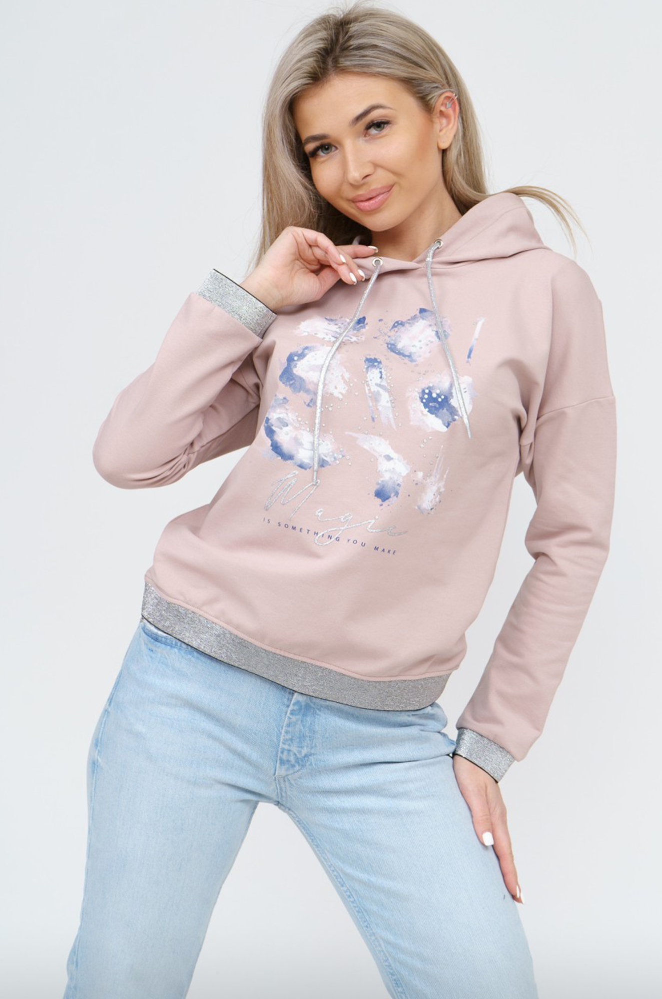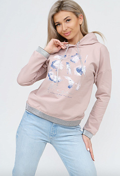 Стильная женская толстовка с капюшоном. Модель прямого кроя, на полочке печатный принт, низ изделия и рукава на эффектной широкой резинке с люрексом. Ткань петельчатый футер с лайкрой. |
