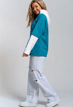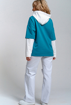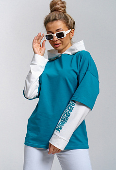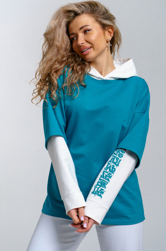 Стильная женская толстовка с капюшоном - имитация "двойки". Модель свободного кроя, на рукаве эффектный печатный принт.. Ткань - практичный, износостойкий и простой в уходе футер с лайкрой |