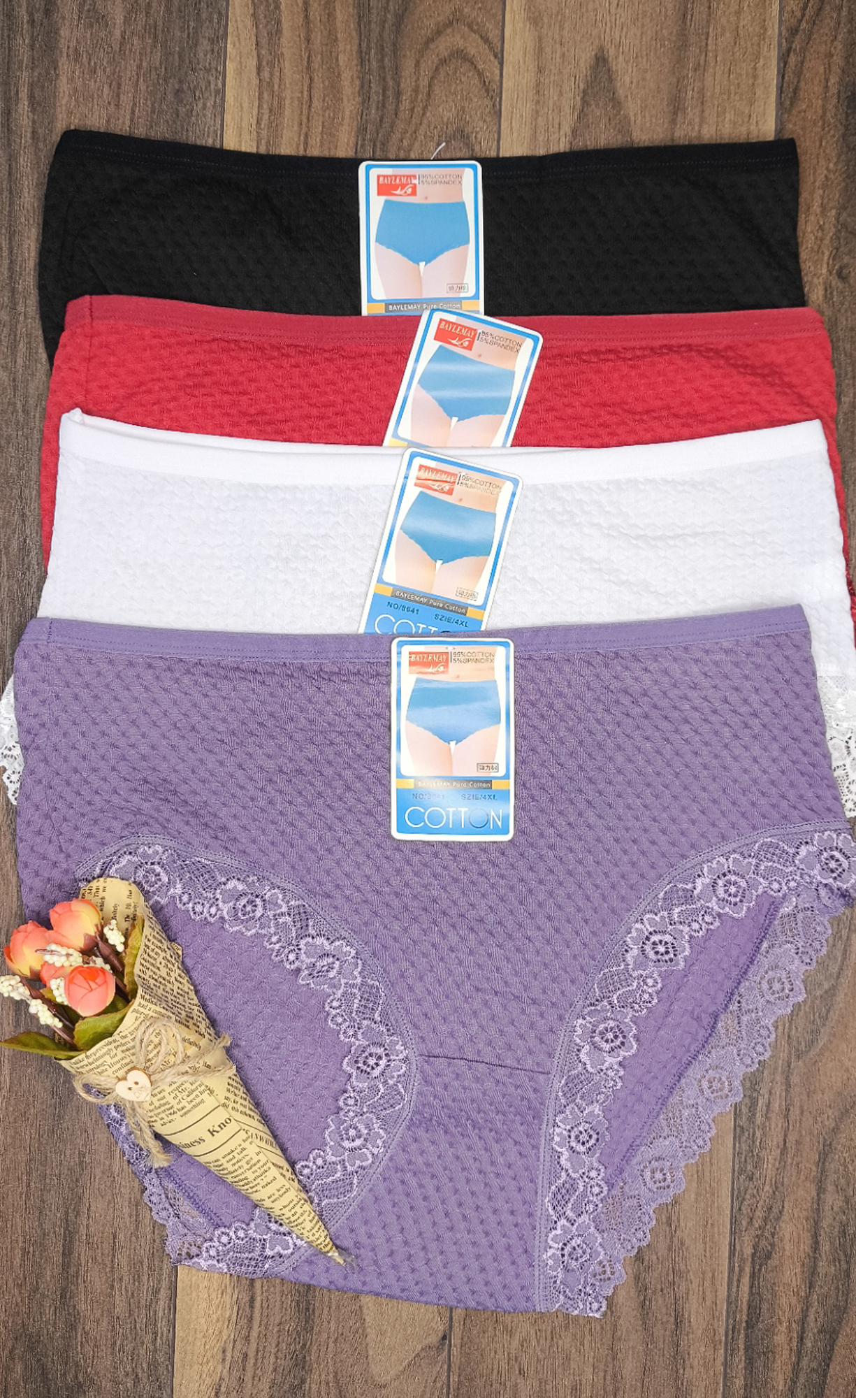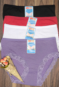 Однотонные женские трусики из хлопковой ткани "жатка". Модель удобной посадки, с неглубоким вырезом бедра, по краю отделка кружевом. Производство - Китай. Внимание!!! Нижнее бельё продаётся упаковками по 3 штуки разного цвета, без подборки по цветовой гамме. Цена указана за 1 штуку. |