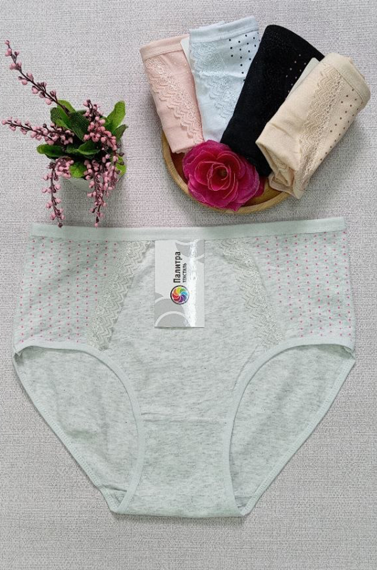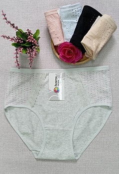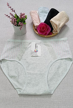 Женские трусики из хлопка с эластаном. Передняя часть с набивным рисунком и полосками пришивного кружева. ВНИМАНИЕ!!! Данный товар продается упаковками по 3 штуки разного цвета, без подборки по цветовой гамме! Цена указана за 1 шт. |