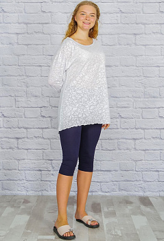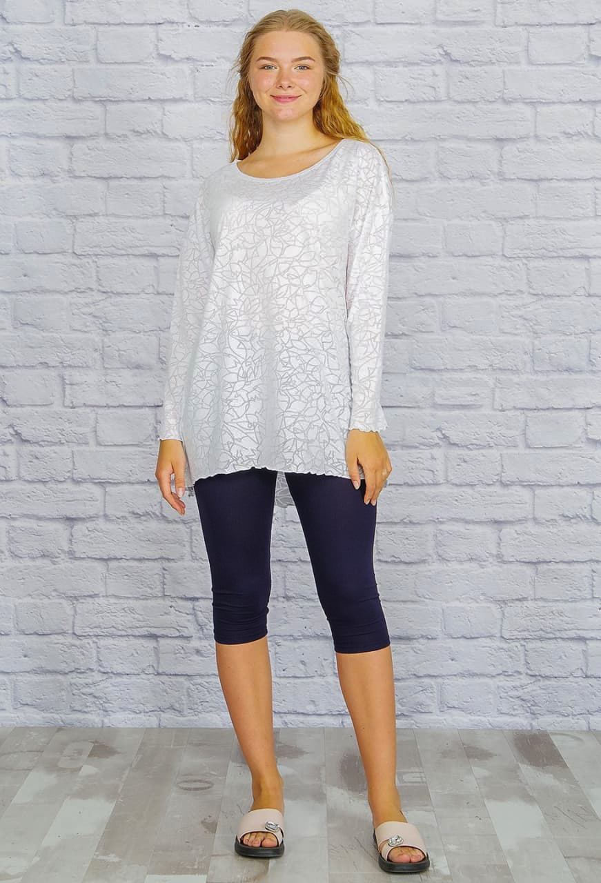 Красивая женственная туника свободного силуета. Спинка немного удлиненная, широкий округлый вырез горловины. Модель выполнена из ткани "деворе", рисунком и фактурой напоминающей витраж. |