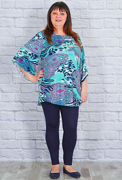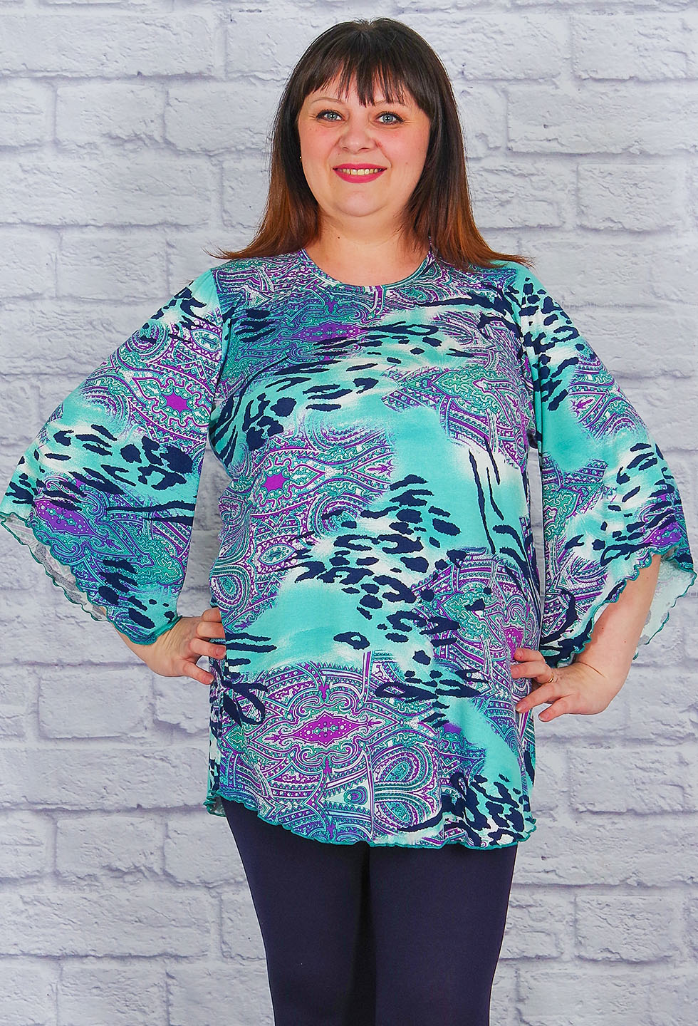Яркая блузка для дам с пышными формами. Оригинальный крой рукава делает модель эффектной, комфортная длина прикрывает бёдра. Ткань мягкая, приятная к телу вискоза. |
