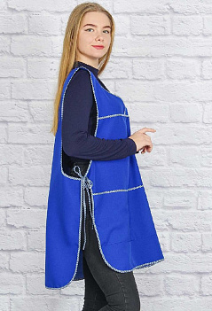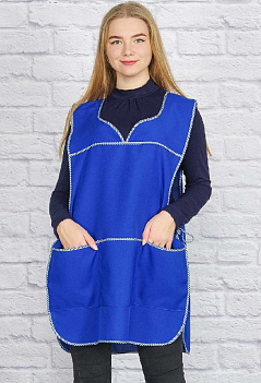 Женский фартук с закрытой спинкой для рабочего персонала. На полочке большой накладной карман с тремя отделениями, фигурный вырез горловины, по бокам завязки регулируют объём изделия. Все края обработаны отделочным кантом. Хороший и удобный вариант для защиты одежды от загрязнений. Размер универсальный (подходит от 44 до 56). Ткань габардин. |