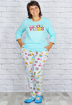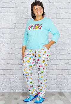 Яркий домашний комплект с брюками и футболкой. Футболка с рукавом 3/4 и с окантовкой в цвет брюк, На полочке печатный принт. Брюки с удобными карманами, пояс на резинке. Ткань - кулирка. |