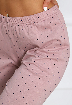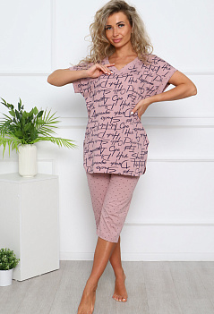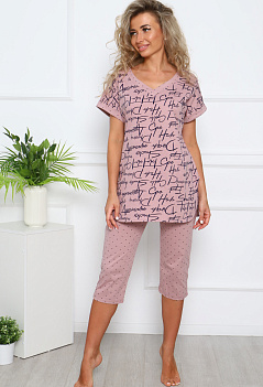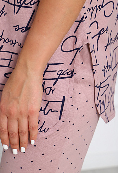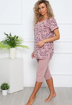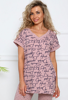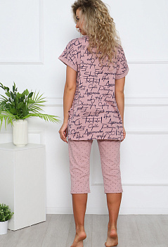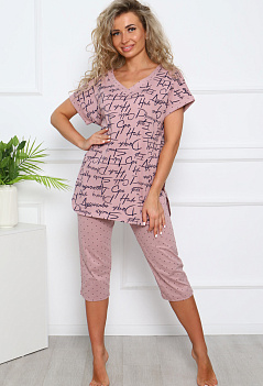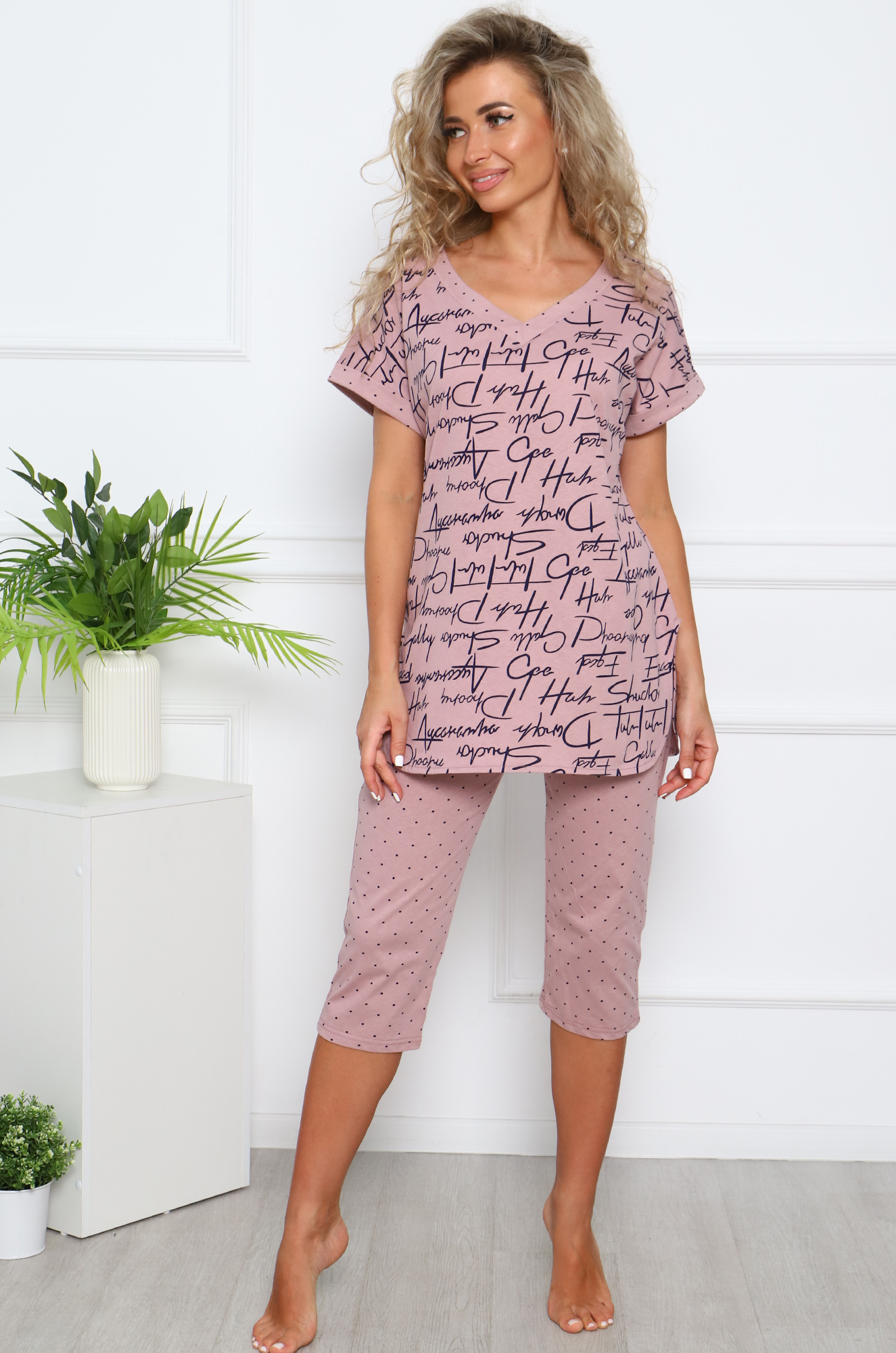 Женский хлопковый костюм-пижама с бриджами подойдёт и для сна, и для отдыха. Футболка длинённая с закругленным низом, свободного кроя, с цельнокроеным рукавом на манжетах. Глубокий вырез "галочкой" подчеркнёт зону декольте и сделает образ привлекательным и женственным. Бриджи на широкой резинке без карманов. Ткань - приятная и мягкая кулирка. |