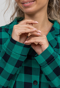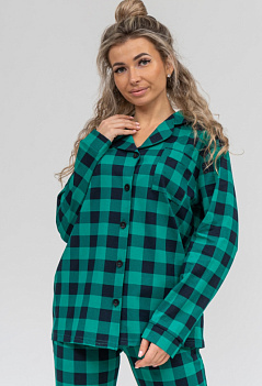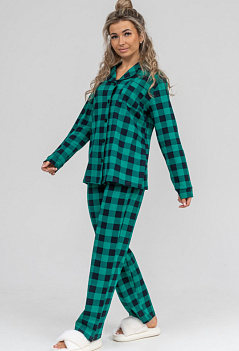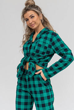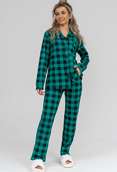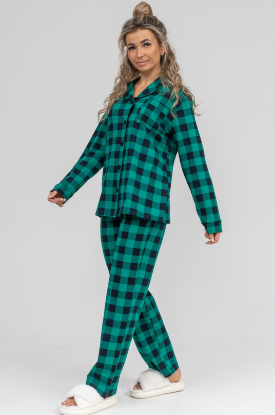 Очень популярная и стильная модель домашнего костюма-пижамки на пуговицах. Рубашка с отложным воротником и длинным рукавом на манжете, на груди накладной кармашек. Брючки прямые без манжет, с боковыми удобными карманами, пояс на широкой резинке. Ткань кулирка высокого качества, очень приятная к телу, мягкая. |