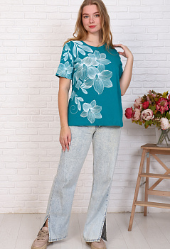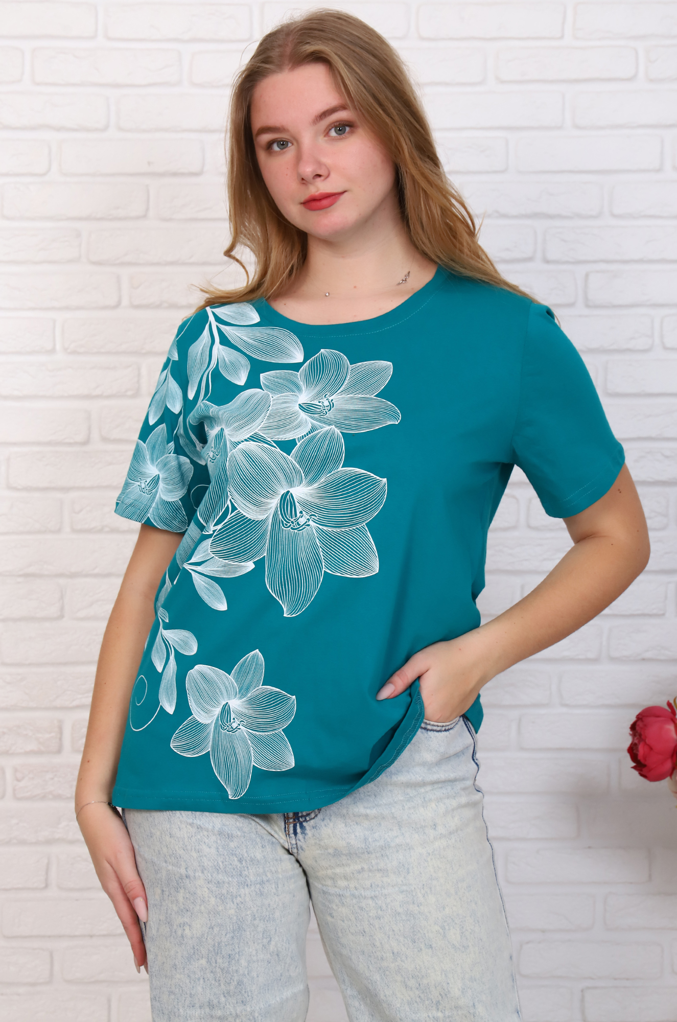 Хлопковая футболка с цветочным печатным принтом придаёт женственности и романтичности. Модель классического прямого кроя. Ткань- качественное кулирное полотно. |