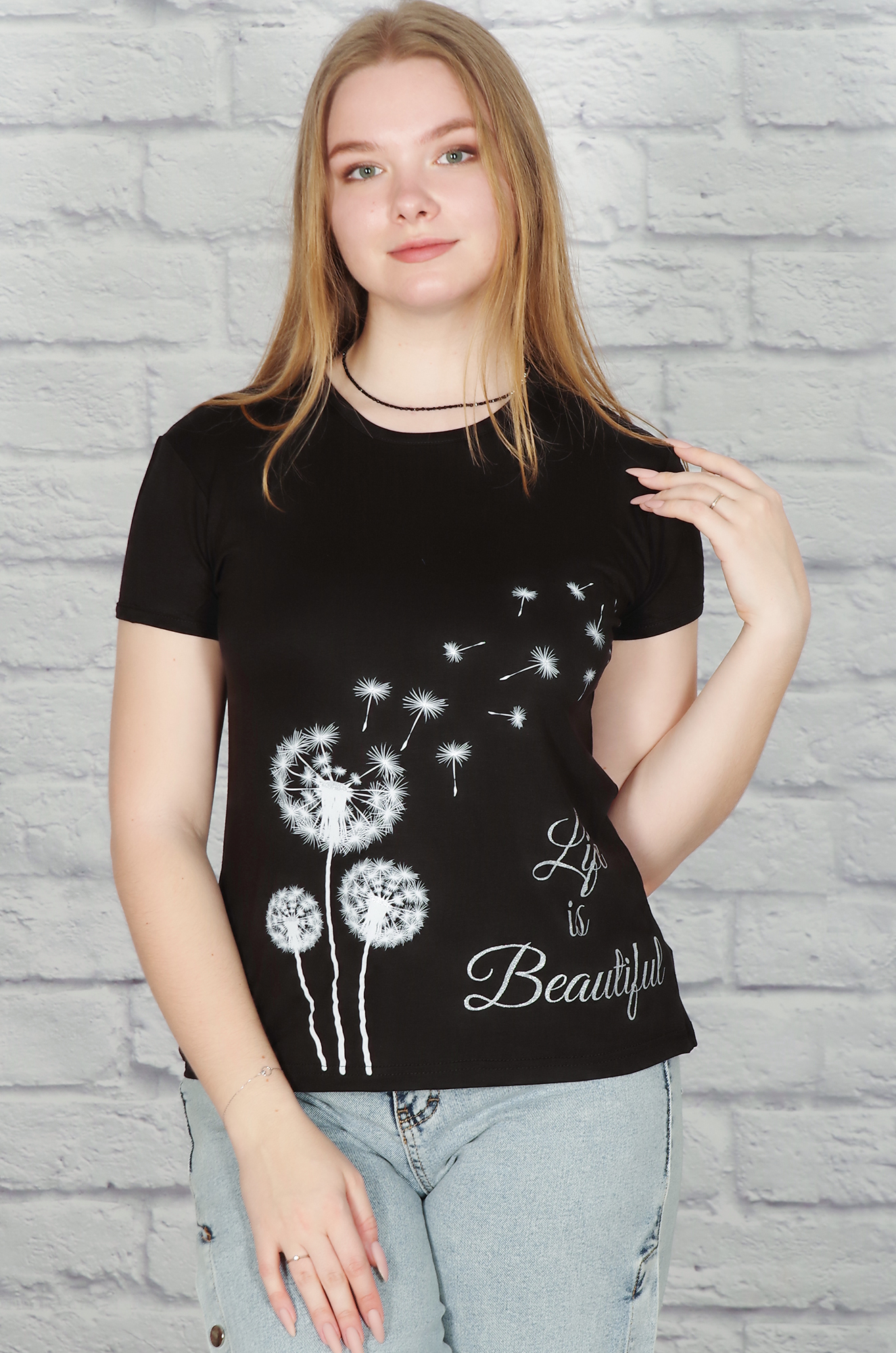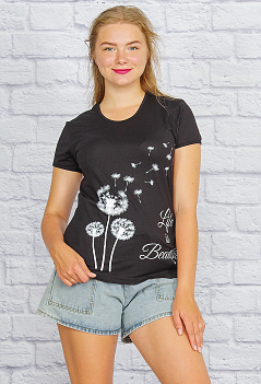 Описание: Обворожительно, грациозно и очень женственно смотрится футболка с изящным принтом "одуванчики".