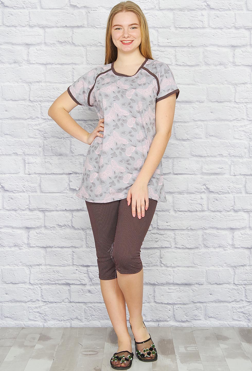 Удобный домашний костюмчик. Футболка прямого кроя, горловина, плечевой шов и рукава окантованы. Бриджи облегающие, пояс на резинке. Ткань набивная кулирка. |