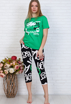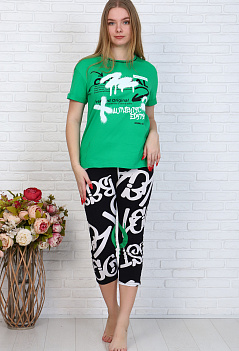 Очень симпатичный и комфортный домашний костюм для современных женщин. Футболка классического прямого кроя, рукав с подворотом, на полочке тематический печатный принт. Бриджи облегающего кроя, пояс на резинке, удобные боковые карманы. Ткань кулирка - мягкая, приятная к телу. |
