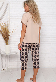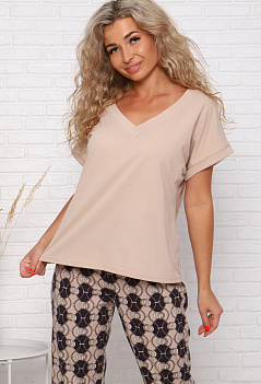 Удобный, стильный и невероятно женственный костюм для повседневного образа. Футболка свободной модели "оверсайз", слегка приталенного силуэта, рукав цельнокроенный на манжетах. Глубокий и очень изящный вырез "галочкой" подчеркнёт зону декольте и сделает образ привлекательным. Бриджи прямого кроя, не стесняют движения, комфортной длины, пояс на резинке. Прекрасный вариант для дома и дачи, на отдых или прогулку. Ткань кулирка. |