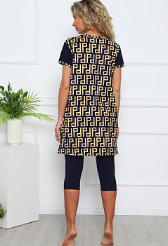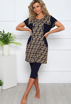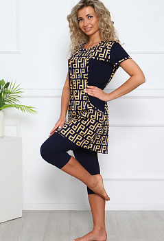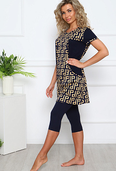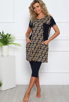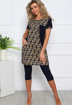 Лёгкий, комфортный домашний костюм: бриджи и туника. Туника комбинированная, с удобными карманами. Бриджи прямого кроя, пояс на резинке. Ткань: туника - кулирка; бриджи - кулирка с лайкрой. |