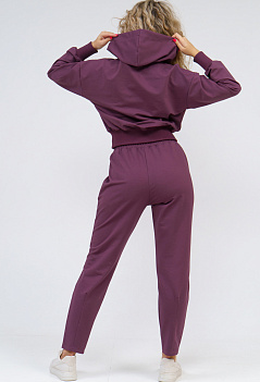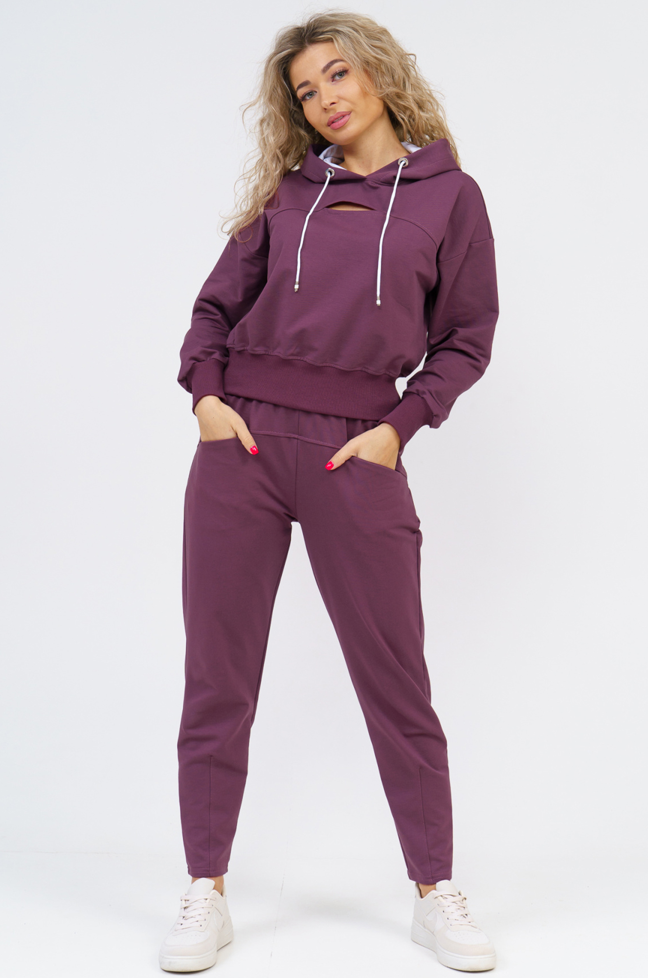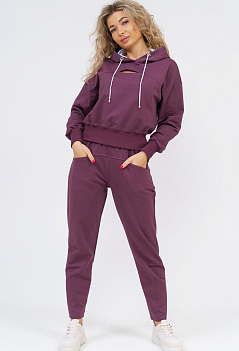 Стильный женский костюм спортивного кроя подойдёт и для дома и для прогулок. Укороченная толстовка с капюшоном подчеркнёт стройность фигуры. Оригинальный элемент - небольшой вырез по линии кокетки в области груди. Рукава и нижняя часть толстовки на манжете. Брюки слегка зауженные внизу, на кокетке, с карманами, пояс на широкой резинке. Ткань - практичный петельчатый футер с лайкрой. |