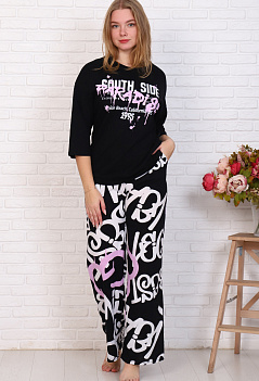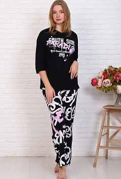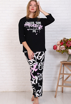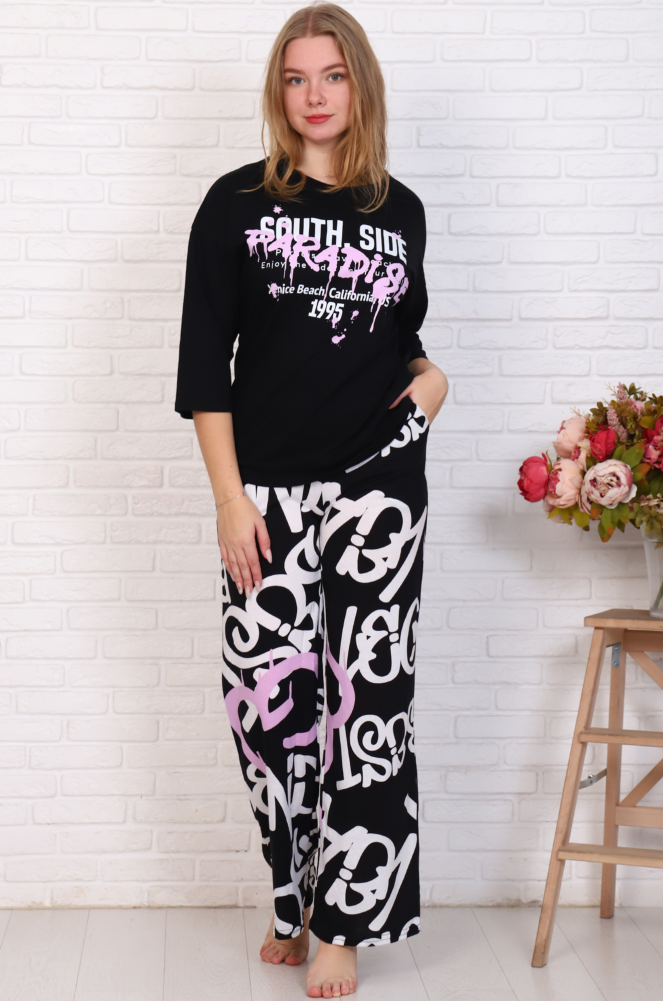 Очень симпатичный, яркий и комфортный домашний костюм для современных женщин. Футболка классического прямого кроя, на полочке тематический печатный принт, рукав спущенный, длина 3/4. Широкие брюки модного свободного кроя, с удобными боковыми карманами, пояс на широкой резинке. Ткань кулирка - мягкая и приятная к телу. |