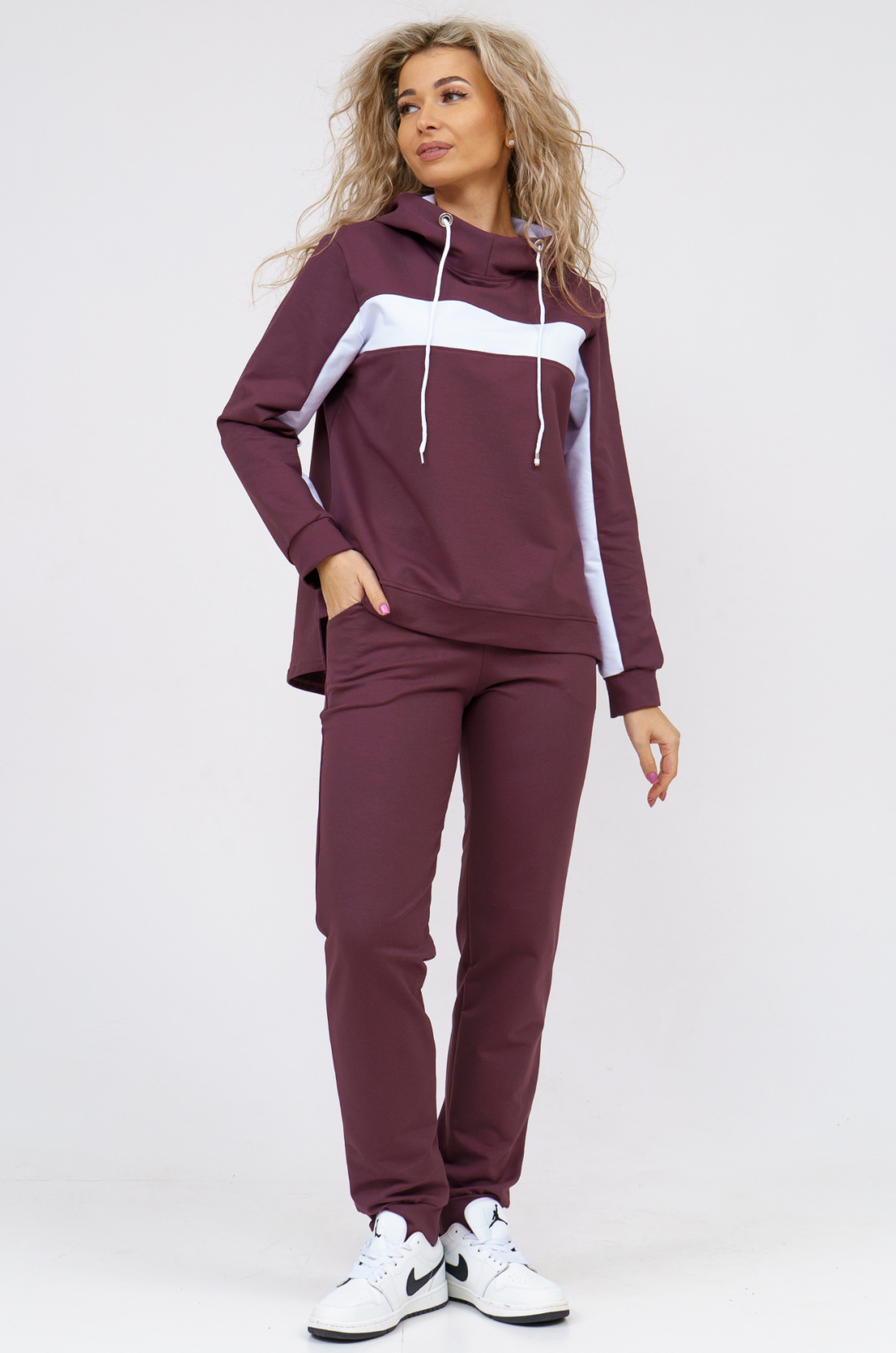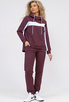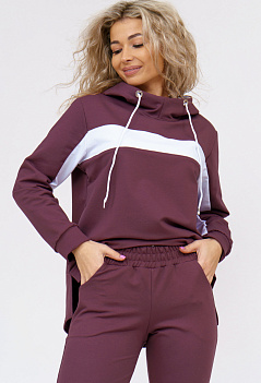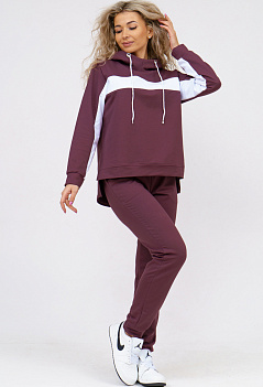 Удобный женский костюм спортивного кроя подойдёт и для дома и для прогулок в парке. Толстовка комбинированная, с контрастной горизонтальной вставкой и с капюшоном. Рукава и нижняя часть полочки на манжете, спинка удлинённая. Внизу по бокам небольшие разрезы. Брюки прямого кроя, с боковыми карманами, пояс на широкой резинке. Ткань - практичный петельчатый футер с лайкрой. |